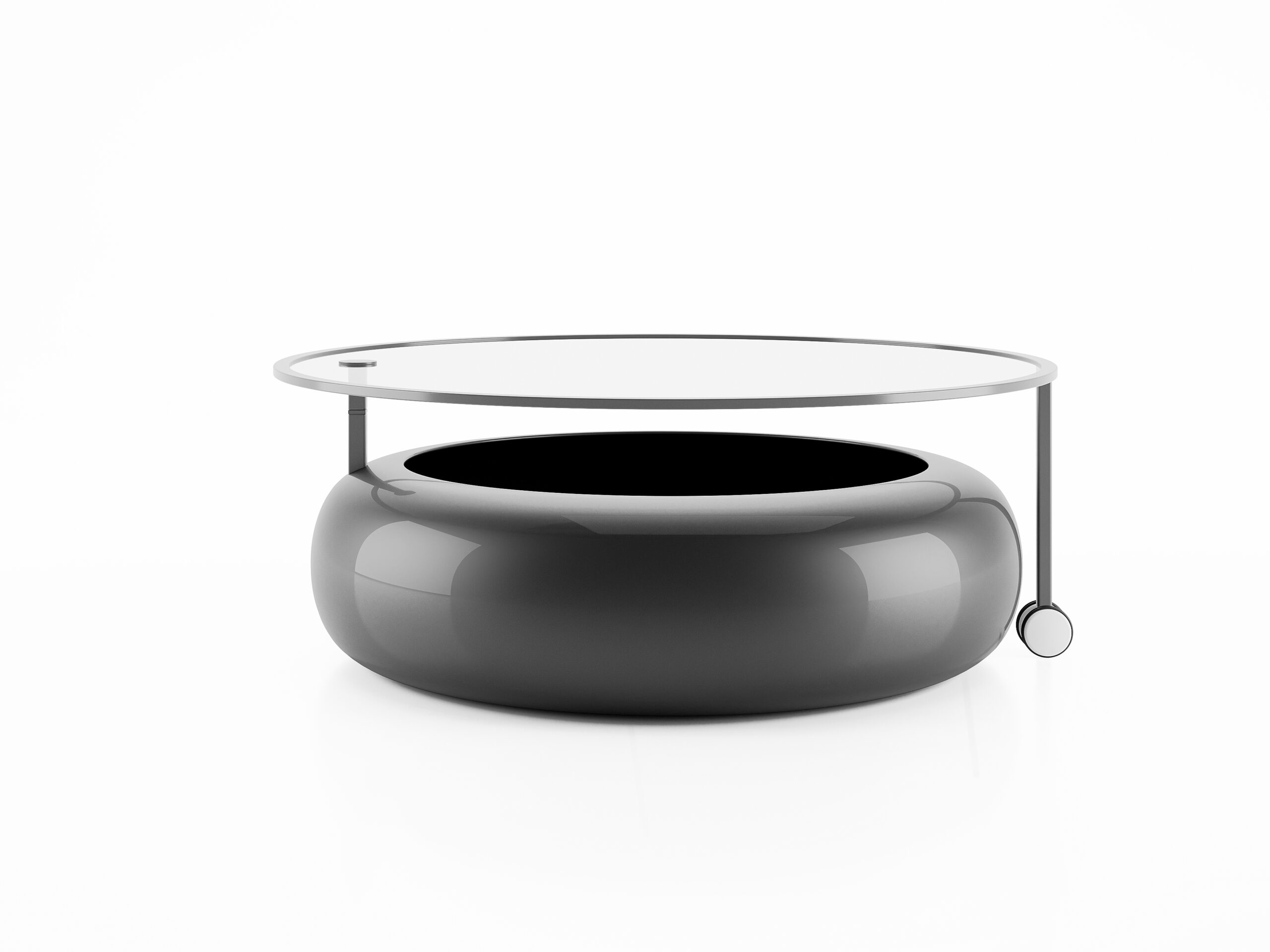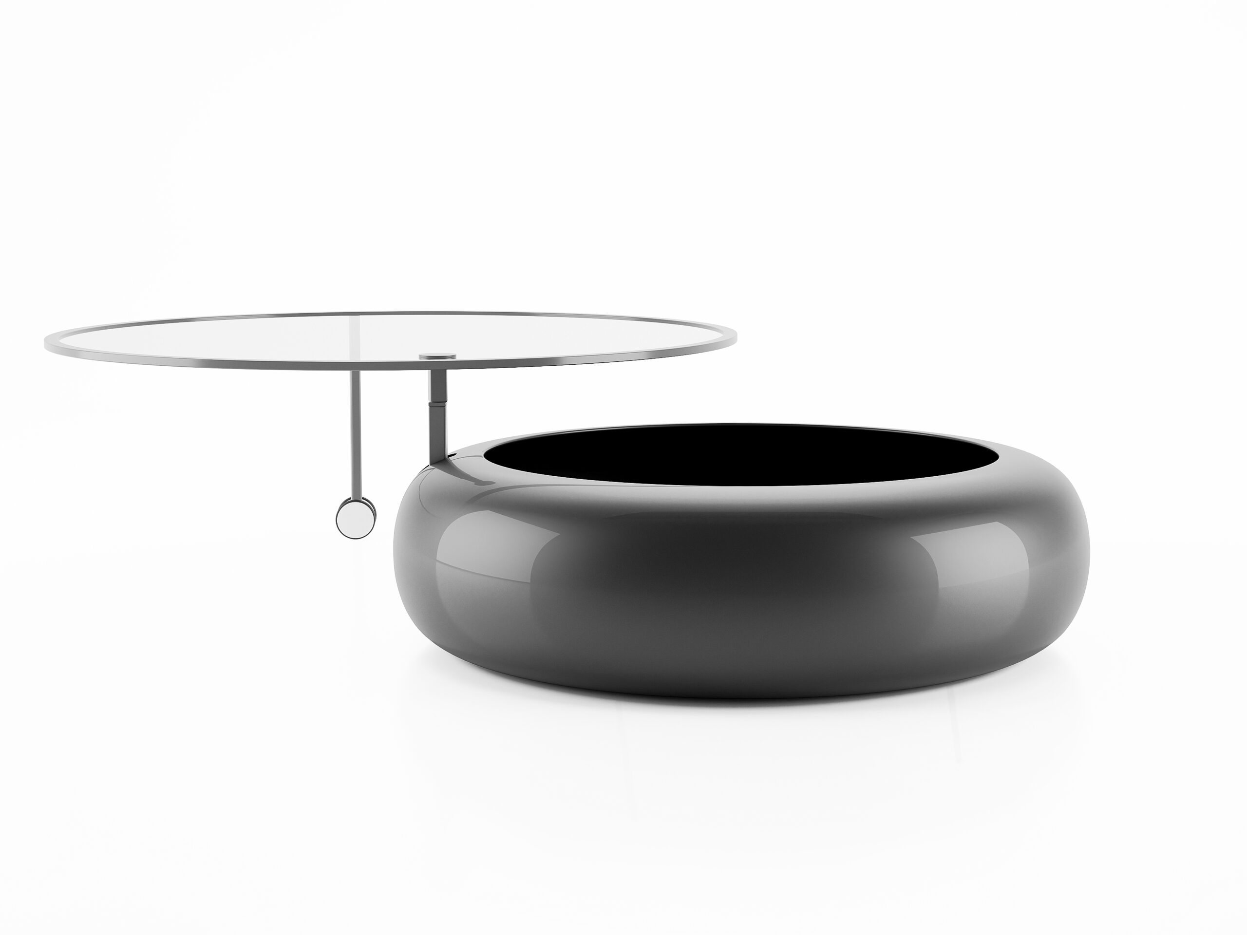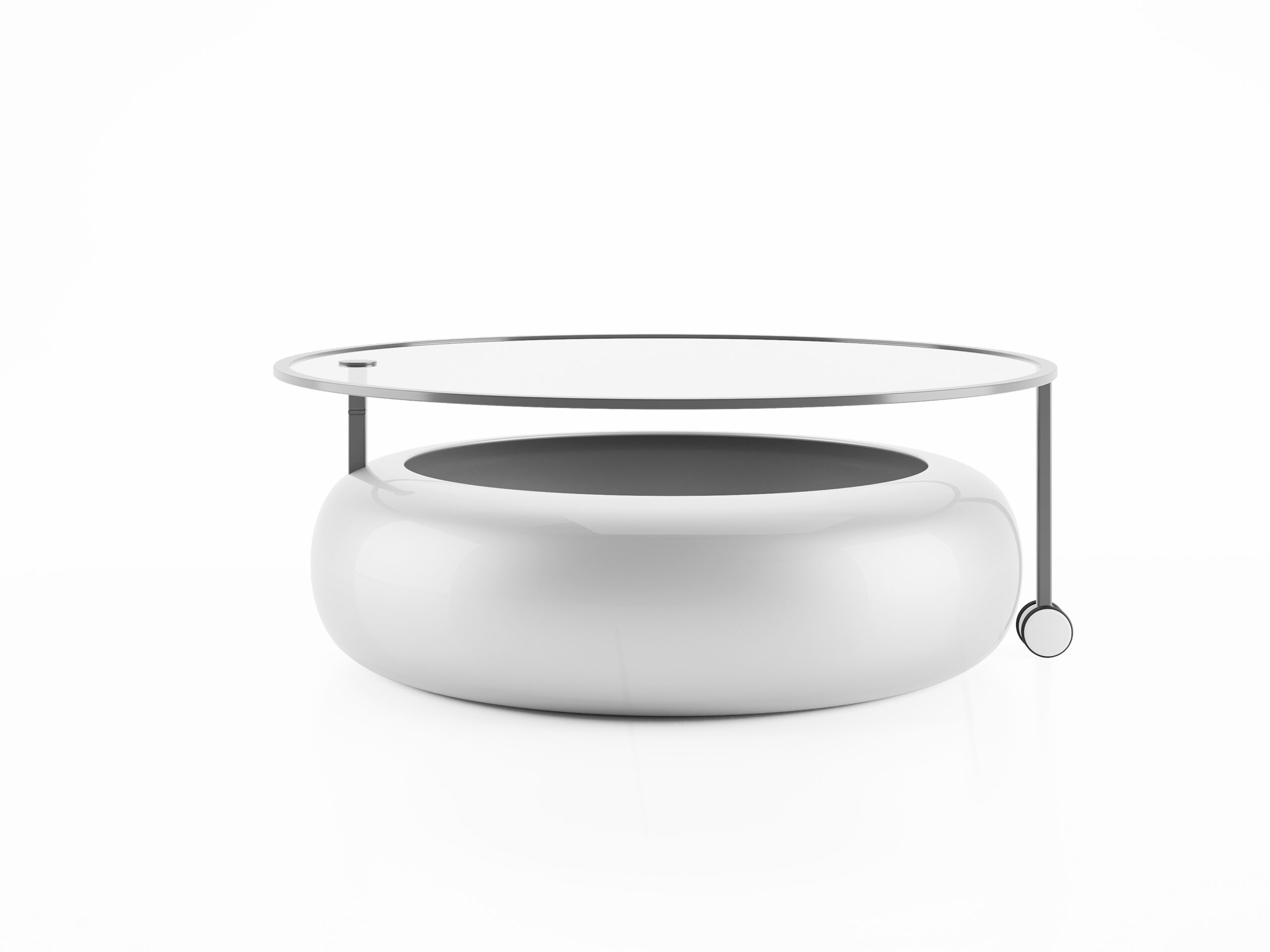 Tableg is a simple and functional coffee table consisting of two elements: The base, which also serves as storage space, and the upper glass surface. They are connected by an arm which passes vertically through the circular base. A second arm that ends in a wheel allows the upper glass surface to be easily shifted, enabling us to place or retrieve objects from the interior and simultaneously bring the upper surface closer to desired points, such as neighboring furniture.