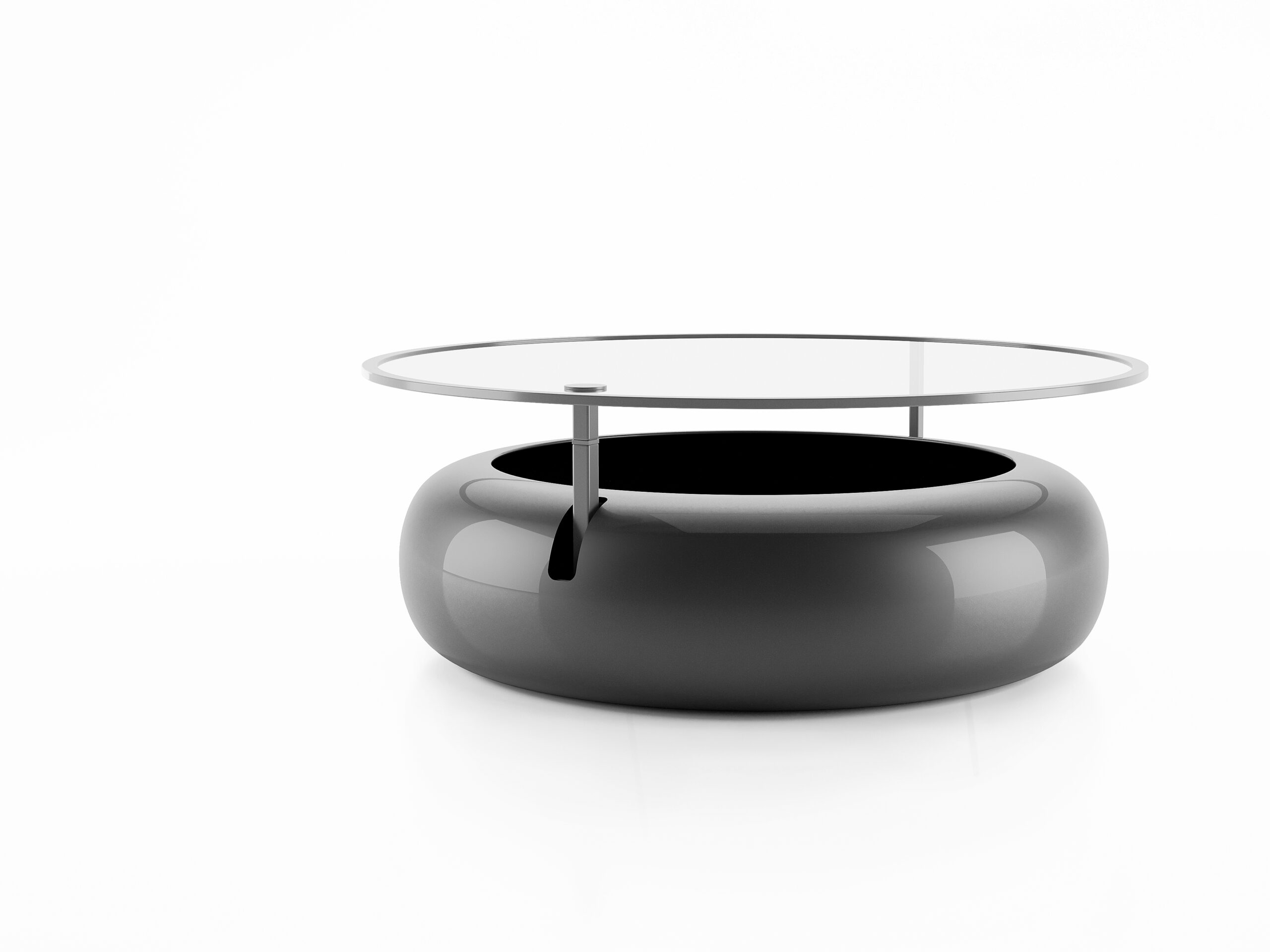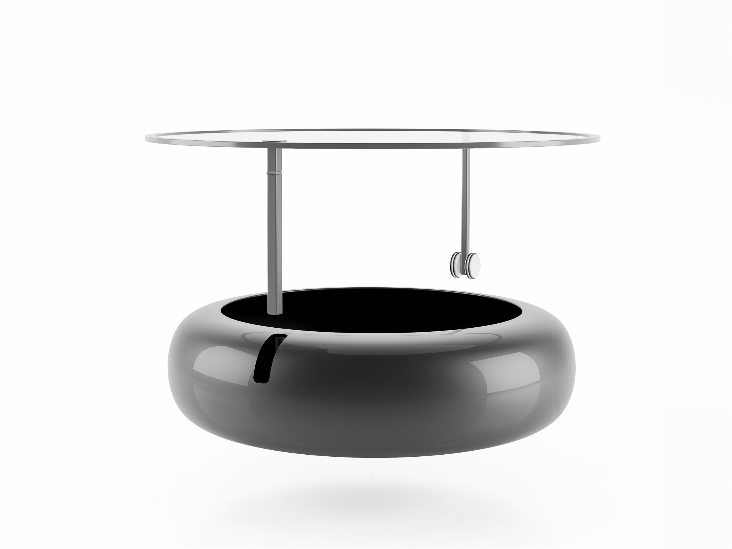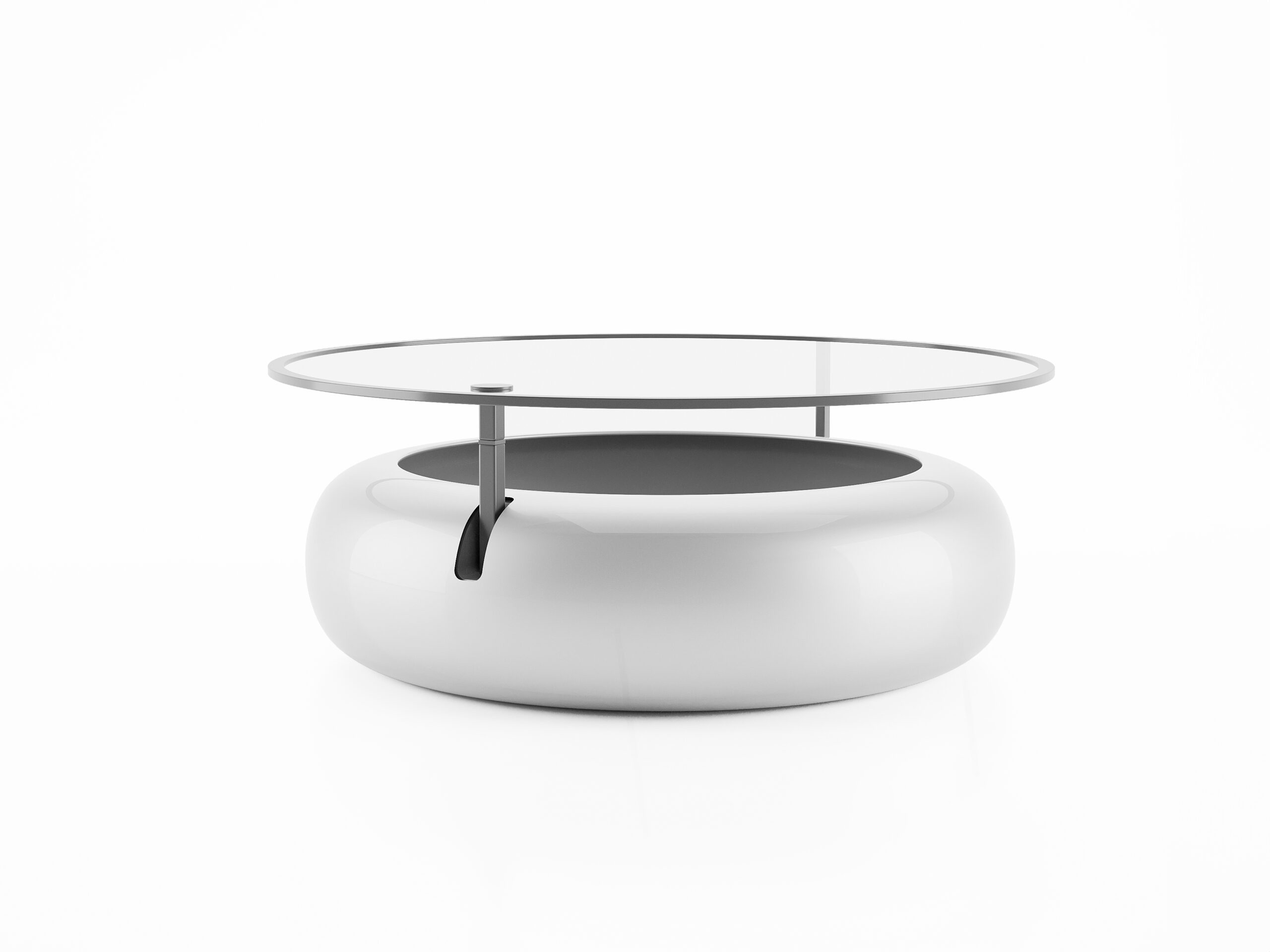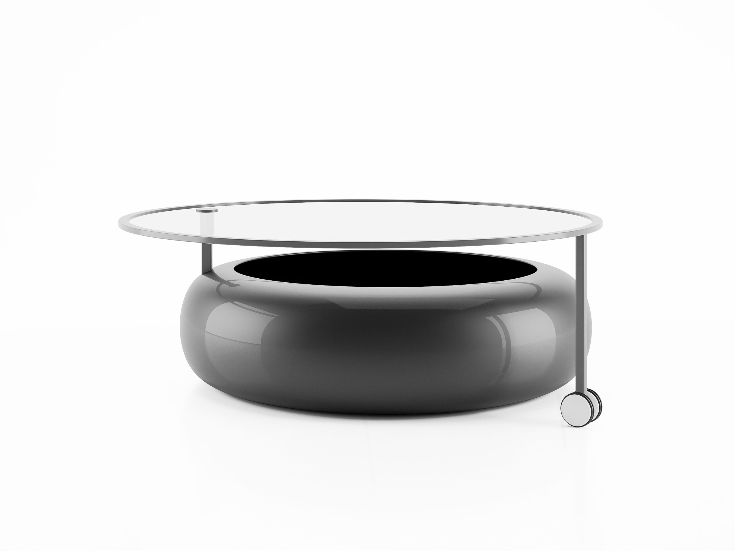 Tableg is a simple and functional coffee table consisting of two elements: The base, which also serves as storage space, and the upper glass surface. They are connected by an arm which passes vertically through the circular base. A second arm that ends in a wheel allows the upper glass surface to be easily shifted, enabling us to place or retrieve objects from the interior and simultaneously bring the upper surface closer to desired points, such as neighboring furniture.